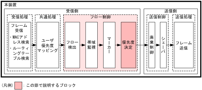 優先度決定は,フロー検出で検出したフレームの優先度をCoS値で指定して,送信キューを決定する機能です。本機能の対象となるフレームは優先度決定動作変更の設定有無によって異なります。詳細は,「3.10.1 優先度決定動作変更」を参照してください。