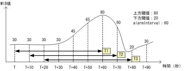 上方閾値を50,下方閾値を20,alarmIntervalを60として,CPU使用率のMIB値をdelta方式で監視した場合の例を次の図に示します。