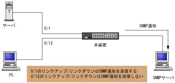 図22‒31 リンクトラップの構成図 ここでは,ポート0/1については,SNMP通知を送信するので,コンフィグレーションの設定は必要ありません。ポート0/12については,SNMP通知を送信しないように設定します。
