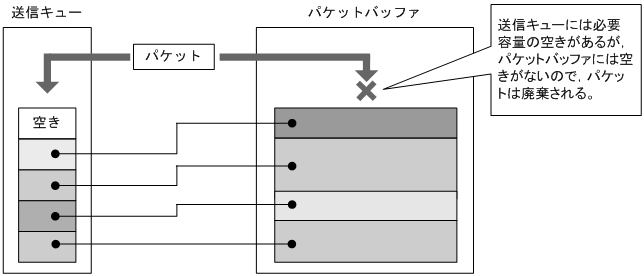 送信キューに空きがないためパケットが廃棄される場合の動作イメージを次に示します。