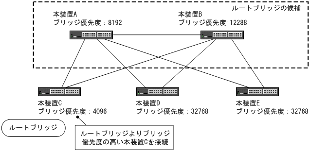 - 本装置A,本装置Bをルートブリッジの候補として運用