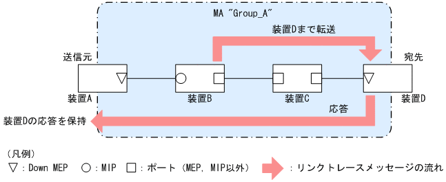 応答を返したMIPは宛先までリンクトレースメッセージを転送します。装置Cのように,MEPまたはMIPが設定されていない装置は応答を返しません(応答を返すには一つ以上のMIPが設定されている必要があります)。