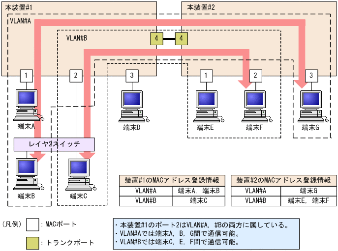 MAC VLANの構成例を次の図に示します。VLANを構成する装置間にトランクポートを設定している場合は,送信元MACアドレスに関係なくVLAN TagによってVLANを決定します。そのため,すべての装置に同じMACアドレスの設定をする必要はありません。装置ごとにMACポートに接続した端末のMACアドレスを設定します。