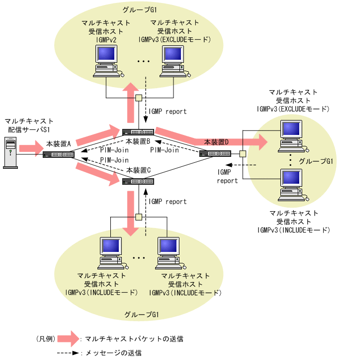 マルチキャストパケット配信サーバ(送信元アドレス:S1)がグループ1(グループアドレス:G1)にマルチキャストパケットを配信する場合の動作を次に示します。