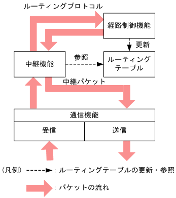 経路情報の送受信や,中継経路を決定してルーティングテーブルを作成する機能です。
