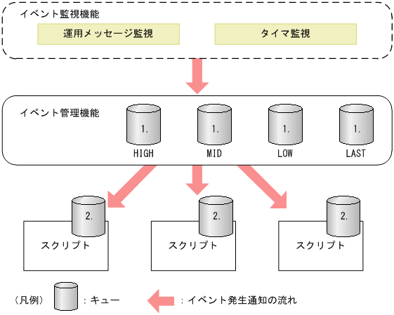 監視イベントの発生頻度が高い場合,イベント発生通知がスクリプトに通知される前に廃棄されることがあります。イベント発生通知の流れを次の図に示します。図中の1.および2.の通知受信キューが満杯になると,廃棄が発生します。