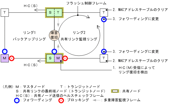 - 共有ノードは対向の共有ノードが送信した多重障害監視フレームを受信して,多重障害の復旧を検出します。