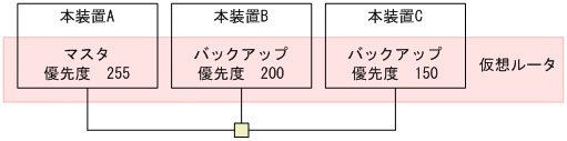 この図の場合,優先度が最も高い仮想ルータAがマスタになります。仮想ルータAがダウンした場合は,次に優先度の高い仮想ルータBがマスタへと変化します。仮想ルータAと仮想ルータBの両方がダウンした場合にだけ仮想ルータCがマスタになります。