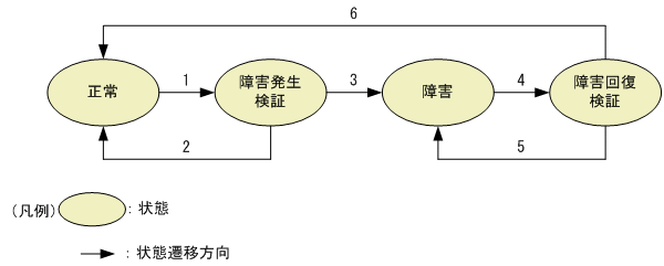状態 優先度 ポーリング試行間隔 正常 コンフィグレーションコマンドvrrp priorityで設定した優先度 track check-status-interval 障害発生検証 track failure-detection-interval 障害 コンフィグレーションコマンドvrrp track priorityで設定した切替優先度,またはコンフィグレーションコマンドvrrp track decrementで設定した優先度減算値によって,優先度を下げる track check-status-interval 障害回復検証 track recovery-detection-interval VRRPポーリングでの状態遷移と状態遷移条件を次に示します。