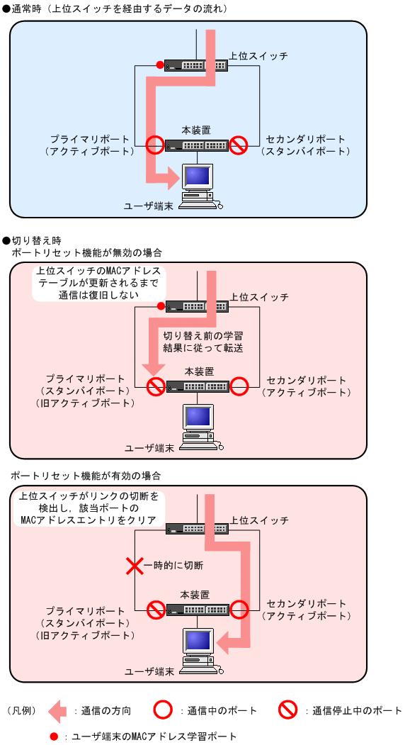 - ポートリセット機能が有効の場合,アクティブポートをセカンダリポートに切り替えると同時に,旧アクティブポートであるプライマリポートを一時的にダウンさせます。旧アクティブポートの接続先である上位スイッチは,リンクダウンを検出し,該当ポート上で学習したMACアドレスを削除するため,通信を速やかに復旧できます。
