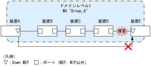 ドメイン内にMIPが設定されていない構成の例を次の図に示します。この例では,ネットワークに障害が発生した場合,装置A,装置EのMEP間で通信できないことは確認できますが,どこで障害が発生したのか特定できません。