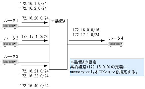 本装置Aは,ルータ1より172.16.1.0/24,172.16.2.0/24,…,172.16.20.0/24を受信し,ルータ2より172.17.1.0/24を受信し,ルータ3より172.16.21.0/24,172.16.22.0/24,…,172.16.40.0/24を学習します。本装置Aでは,集約経路172.16.0.0/16と学習経路172.17.1.0/24をルータ4へ広告するように広告経路フィルタを設定します。このとき,summary-onlyパラメータを指定して学習経路から集約経路172.16.0.0/16を生成するように設定した場合,広告経路フィルタに集約元経路の広告を抑止する設定が不要となります。経路集約のコンフィグレーション例と経路集約前後の経路を次の図に示します。