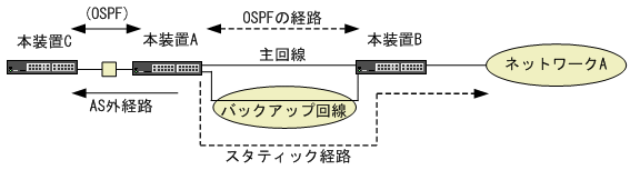 本装置Aでは主回線でOSPFを動作させ,バックアップ回線にネットワークAへのスタティック経路を設定します。さらに,スタティック経路のディスタンス値を,OSPFのエリア内経路のディスタンス値よりも大きな値(優先度が低い)に設定します。これによって,ネットワークAへの経路はOSPFで学習したAS内経路が選択されます。主回線障害時,本装置Aでは該当するAS内経路が削除されてスタティック経路を再選択しますが,本装置CではネットワークAへの経路情報が存在しなくなります。本装置AでのネットワークAへのスタティック経路情報をAS外経路として本装置Cに広告するためには,本装置Aで経路再配布のコンフィグレーションを設定する必要があります。こうすることで,バックアップ回線上でHelloパケットを交換しないで主回線障害時にもOSPFにネットワークAへの有用な経路情報を導入できます。