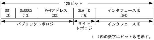 6to4トンネルで使用するアドレス形式です。プレフィックスとして2002::/16が割り当てられていて,17ビット目から48ビット目にトンネルを使用するサイトのIPv4アドレスを設定します。6to4アドレスを次の図に示します。
