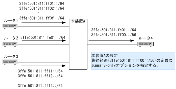 本装置Aは,ルータ1より3ffe:501:811:ff01::/ 3ffe:501:811:ff02::/64,…,3ffe:501:811:ff0f::/64を受信し,ルータ2より3ffe:501:811:fe01::/64を受信し,ルータ3より3ffe:501:811:ff11::/64,3ffe:501:811:ff12::/64,…,3ffe:501:811:ff1f::/64を学習します。本装置Aでは,集約経路3ffe:501:811:ff00::/56と学習経路3ffe:501:811:fe01::/64をルータ4へ広告するように広告経路フィルタを設定します。このとき,summary-onlyパラメータを指定して学習経路から集約経路3ffe:501:811:ff00::/56を生成するように設定した場合,広告経路フィルタに集約元経路の広告を抑止する設定が不要となります。経路集約のコンフィグレーション例と経路集約前後の経路を次の図に示します。