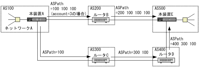 ルータAが自ASに存在するネットワークAをAS200経由で通知するとき,AS500に到達する経路情報のAS_PATH属性は「200 100」を持ちます。ルータAが自AS内のネットワークAをAS300,AS400経由で通知するとき,AS500に到達する経路情報のAS_PATH属性は「400 300 100」を持ちます。したがって,AS500の本装置Eは最も短いAS_PATH属性を持つAS200経由で到達した経路を選択します。
