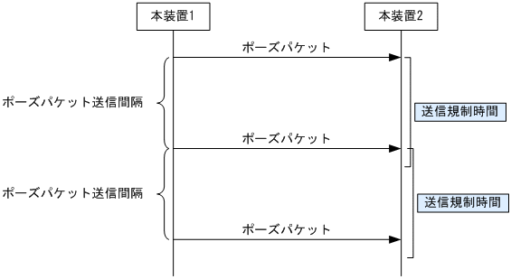 デフォルト動作の場合,“ポーズパケット送信間隔≦送信規制時間”となるため,ポーズパケットの受信側では送信が完全に停止します。デフォルトでの動作シーケンスを次の図に示します。