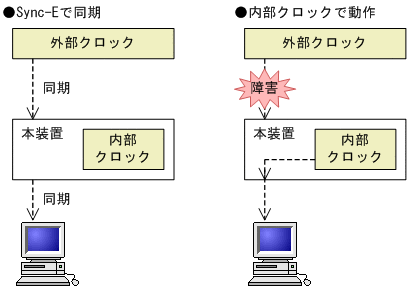 この図の構成では,外部クロックとクロック周波数の同期を取り,同期したクロック周波数で下流の装置と同期します。外部クロックとの同期が外れると,内部クロックで動作します。