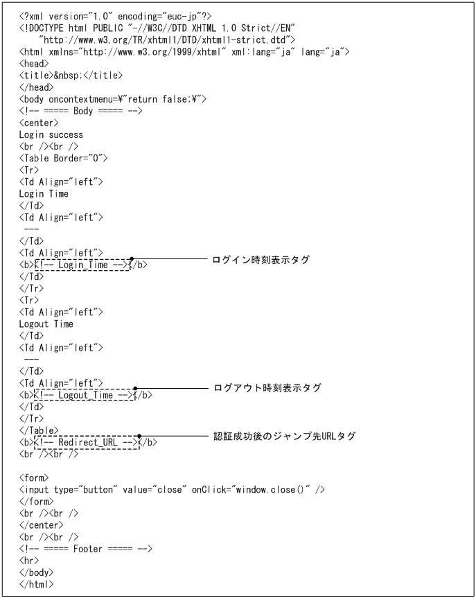 Web認証画面(loginOK.html,logoutOK.html,loginNG.html,logoutNG.html)のサンプルソースを示します。