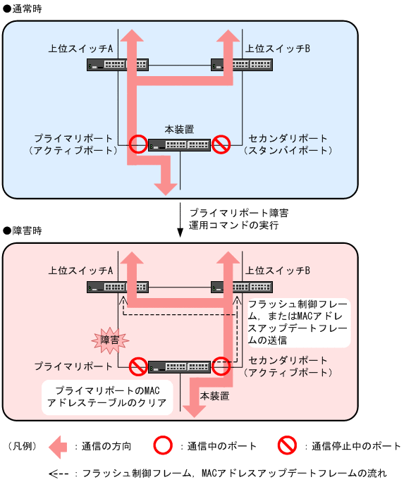 切り替え・切り戻し動作と同時に,通信を行っていたポートで学習していたMACアドレスをすべてクリアして,新しくアクティブポートになったポートで通信を行います。フラッシュ制御フレームまたはMACアドレスアップデートフレームを送信する設定をしている場合は,切り替え・切り戻しと同時に新しくアクティブポートになったポートからフラッシュ制御フレームまたはMACアドレスアップデートフレームを送信します。ポートリセット機能を設定している場合は,旧アクティブポートを一時的にダウンさせます。