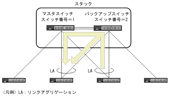 複数のメンバスイッチと接続するリンクアグリゲーションが転送先となる場合,受信したメンバスイッチのポートへ優先して転送します。フレームを受信したメンバスイッチのポートに優先して振り分けることで,スタックリンクの帯域を有効に利用できます。また,スタックを構成するほかのメンバスイッチに障害が発生しても,通信に影響を受けなくなります。優先振り分けを有効に利用するために,スタックでリンクアグリゲーションを使用する場合は,複数のメンバスイッチにわたって設定することをお勧めします。