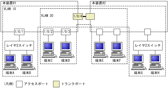 ポートVLANを設定する手順を以下に示します。ここでは,次の図に示す本装置#1の設定例を示します。
