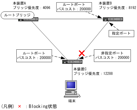 本装置B,本装置C間の接続はルートポート以外のポートでの接続になります。このようなポートではどれかのポートが非指定ポートとなってBlocking状態になります。スパニングツリーは,このように片側がBlocking状態となることでループを防止します。
