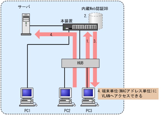 - 本装置の内蔵Web認証DBに登録されたユーザ情報と,PCから入力されたユーザIDおよびパスワードとの一致を確認する認証を行います。