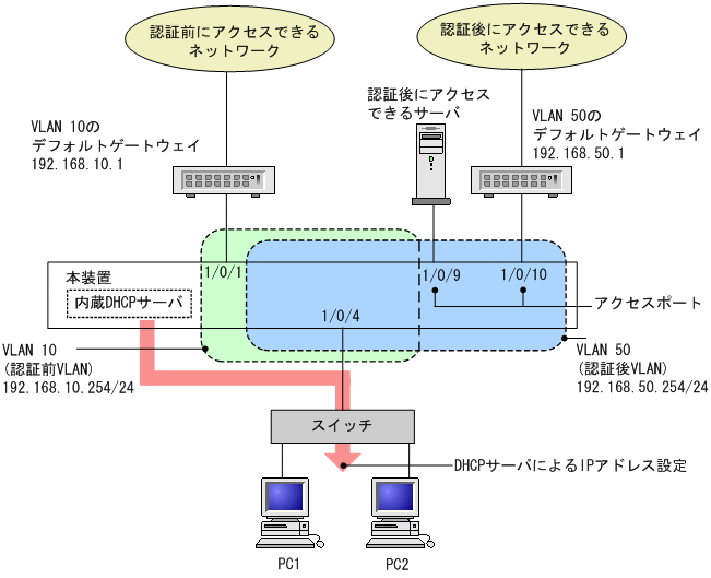 ローカル認証方式を使用する上での基本的な設定を次の図に示します。なお,端末(PC1,PC2)のIPアドレスは,端末側で認証前と認証後に手動で切り替えるものとします。