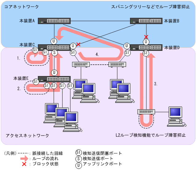 L2ループ検知機能で一般的に設定するポート種別です。本装置C,D,Eで示すように,下位側のポートに設定しておくことで,1,2,3のような下位側の誤接続によるループ障害に対応します。