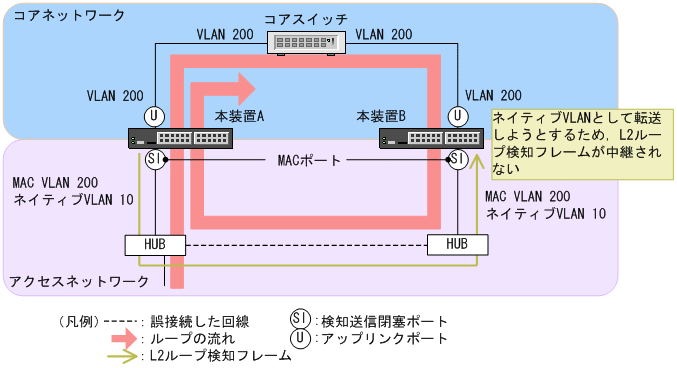 本装置AはHUB側の検知送信閉塞ポートからL2ループ検知フレームを送信し,コアスイッチ側のアップリンクポートからは送信しません。本装置BはMACポートで受信したL2ループ検知フレームをネイティブVLANとして転送しようとするため,L2ループ検知フレームはコアスイッチ側へ中継されません。この場合,L2ループ検知フレームは本装置Aへ戻ってこないため,ループ障害を検知できません。