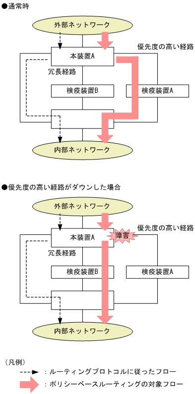 本装置では起動時や再起動時など,ポリシーベースプログラムが動作してから一定時間,中継可否の監視および経路の切り替えを停止します。これは,起動したあとの装置状態を確認していて,その間は次に示す理由で中継可否の監視結果が安定しないためです。