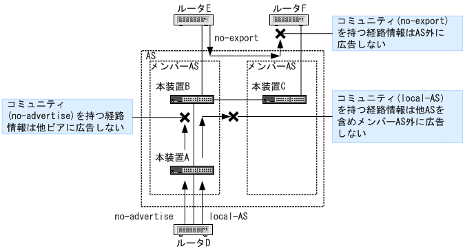 コンフェデレーション構成ではRFC1997で定義されるウェルノン・コミュニティについて,次のように取り扱います。そのほかのコミュニティの取り扱いは,通常構成と同様です。