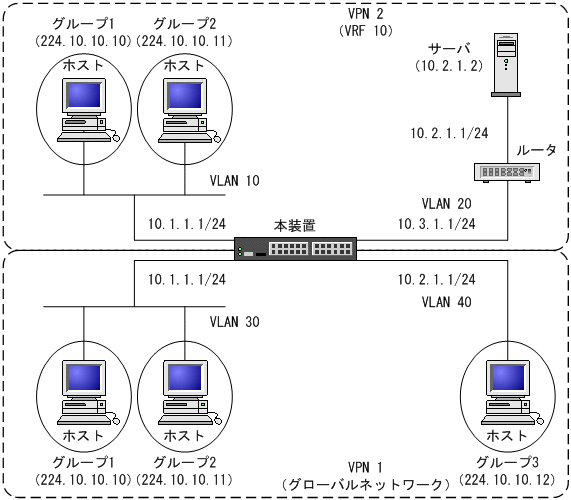 - PIM-SMでマルチキャストエクストラネットによるマルチキャストVRF間通信をする場合,PIM-SM VRFゲートウェイの設定が必要です。PIM-SM VRFゲートウェイは,マルチキャスト送信者が存在するVRFに設定します。設定はグローバルコンフィグレーションモードで行います。エクストラネットで使用するグループアドレスを,ホストアドレス指定ですべてマルチキャスト経路フィルタリングに指定して,PIM-SM VRFゲートウェイを設定します。このとき,ワイルドカードマスクによる範囲指定をしたグループアドレスは,PIM-SM VRFゲートウェイの制御対象外となります。例として,224.10.10.10,224.10.10.11および224.10.10.12のグループアドレスを,VRF 10からグローバルネットワークに中継する設定を示します。この場合,VPN 1(グローバルネットワーク)に,VPN 2(VRF 10)上のサーバ(10.2.1.2)へのユニキャスト経路が存在する必要があります。