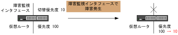 優先度切替方式で「図15-13 優先度切替方式」のように,仮想ルータの優先度を100,障害監視インタフェースの切替優先度として10を指定した場合,障害監視インタフェースで障害が発生すると,仮想ルータの優先度は切替優先度の10に設定されます。