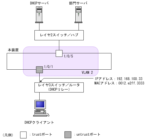 本コマンドが設定されていない場合,MACアドレス詐称検査をするため,untrustポートにDHCPリレーを接続できません。
