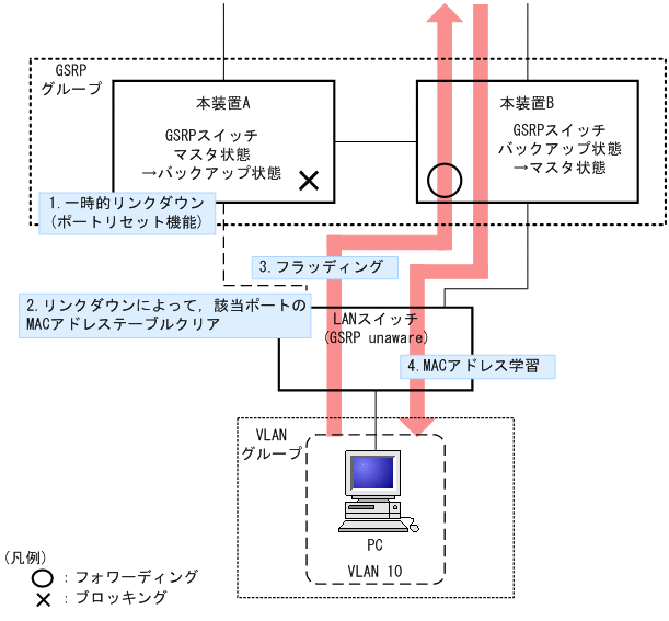 GSRP unawareであるLANスイッチ(以下,本説明内では単にGSRP unawareと表記します)はリンクダウンにより該当ポートのMACアドレステーブルをクリアします。