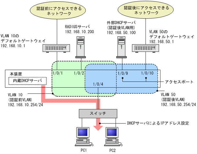 RADIUS認証方式を使用する際の基本的な設定を次の図に示します。なお,端末のIPアドレスは,認証前は本装置内DHCPサーバから配布し,認証後は外部DHCPサーバから配布します。