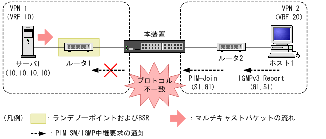 プロトコルが異なる場合,IPv4マルチキャストエクストラネットによるマルチキャスト中継はできません。VRF間のプロトコル不一致で中継できない例および本装置の設定情報を次に示します。