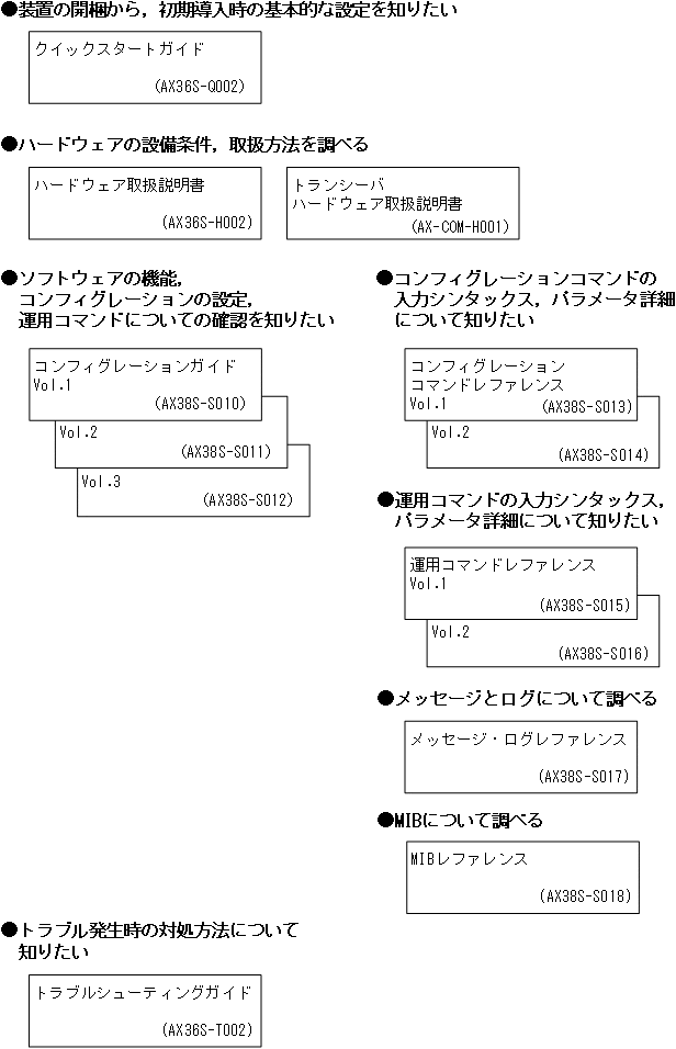 このマニュアルはAX3660Sを対象に記載しています。また,ソフトウェアOS-L3M Ver. 12.2の機能について記載しています。ソフトウェア機能は,ソフトウェアライセンスおよびオプションライセンスによってサポートする機能について記載します。