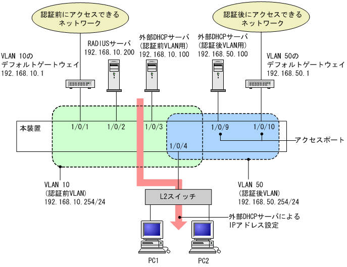 RADIUS認証方式で認証前および認証後に,端末のIPアドレスをそれぞれの外部DHCPサーバから配布する際の構成を次に示します。