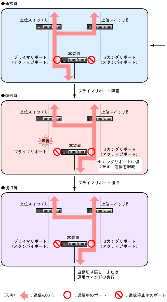 - プライマリポートがリンクアップしてスタンバイポートになっていれば,自動切り戻し機能を使用する,または本装置で運用コマンドを実行することで,アクティブポートをプライマリポートに変更できます。この動作を切り戻しと呼びます。