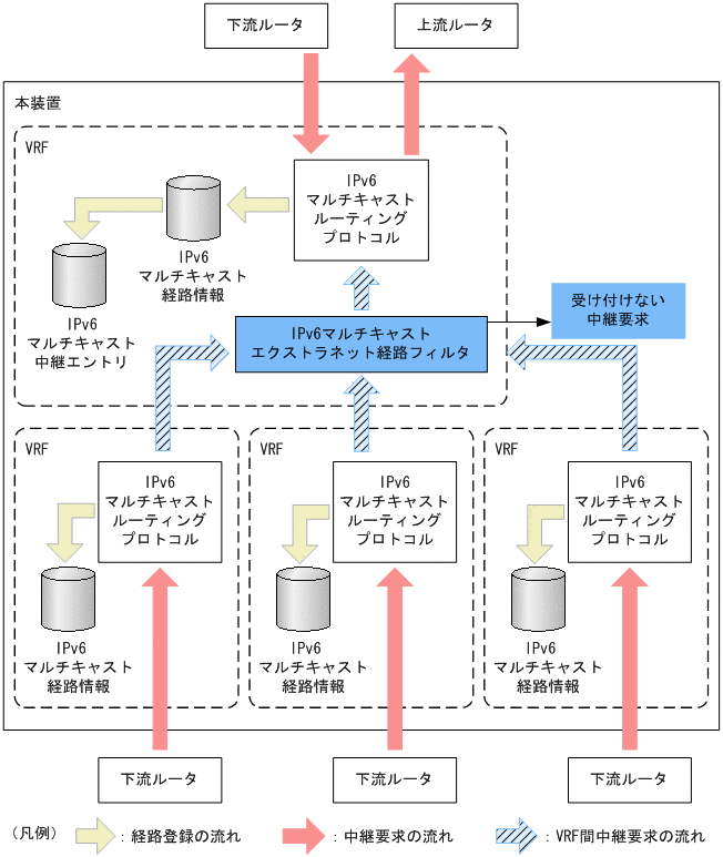 IPv6マルチキャストエクストラネットの経路フィルタリングを設定していない場合,VRF間の中継要求をすべて廃棄します。