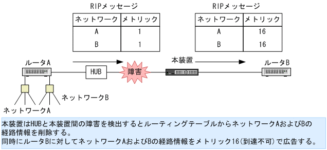 到達できる状態から到達できない状態(メトリック16受信または,インタフェース障害によって該当するインタフェースから学習した経路を削除)となった経路に対して,一定時間(60秒:ガーベジコレクトタイマ)はメトリック16(到達できない)で隣接ルータに広告します。ルートポイズニングを次の図に示します。