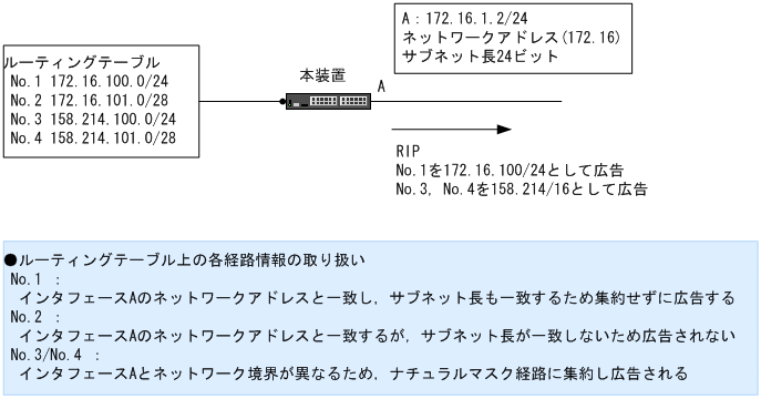 RIPではコンフィグレーションコマンドauto-summaryを設定することで,隣接装置に対して広告する複数のサブネット経路情報を,自動的に一つのナチュラルマスク経路情報として集約し広告できます。このコンフィグレーションコマンドはRIP-1,RIP-2共に有効となります。