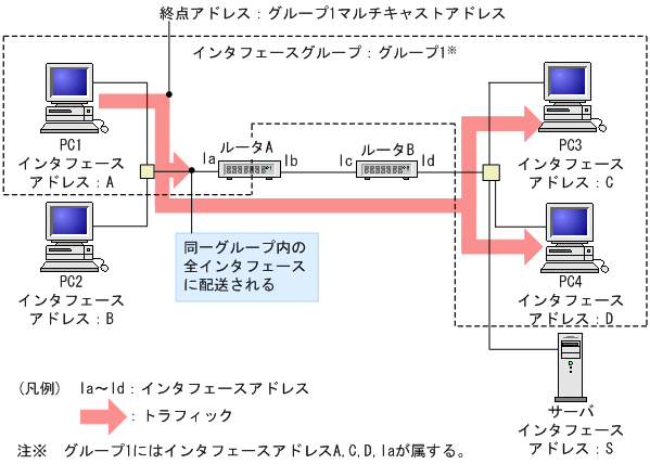 インタフェースの集合を示すアドレスです。終点アドレスがマルチキャストアドレスのパケットは,そのアドレスが示すインタフェース集合のすべてのインタフェースに配送されます。マルチキャストアドレス通信を次の図に示します。
