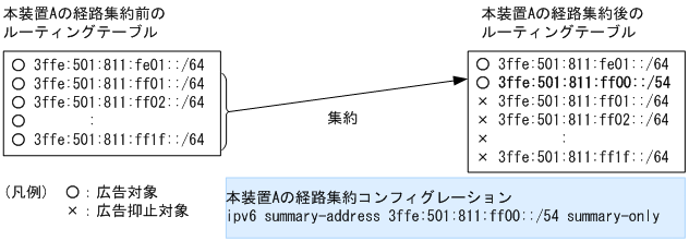 本装置Aは,ルータ1より3ffe:501:811:ff01::/ 3ffe:501:811:ff02::/64,…,3ffe:501:811:ff0f::/64を受信し,ルータ2より3ffe:501:811:fe01::/64を受信し,ルータ3より3ffe:501:811:ff11::/64,3ffe:501:811:ff12::/64,…,3ffe:501:811:ff1f::/64を学習します。本装置Aでは,集約経路3ffe:501:811:ff00::/56と学習経路3ffe:501:811:fe01::/64をルータ4へ広告するように広告経路フィルタを設定します。このとき,summary-onlyパラメータを指定して学習経路から集約経路3ffe:501:811:ff00::/56を生成するように設定した場合,広告経路フィルタに集約元経路の広告を抑止する設定が不要となります。経路集約のコンフィグレーション例と経路集約前後の経路を次の図に示します。
