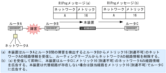 機能 内容 周期的な経路情報広告 自装置が持つ経路情報を隣接ルータに周期的に通知します。 triggered update 自装置の経路情報に変更があったときに定期的な広告を待たないで通知します。 隣接ルータからのリクエストに対する応答 リクエストパケットを送信した隣接ルータに対して通知します。 ルートポイズニング 経路情報が削除されたことを隣接ルータに一定時間通知します。 (a) 周期的な経路情報広告