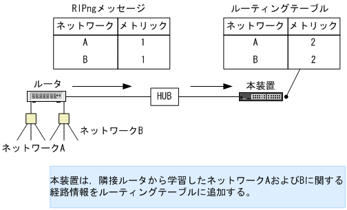 RIPngでは,コンフィグレーションコマンドipv6 rip enableを指定したインタフェースと接続する,すべての隣接ルータ(インタフェースのセカンダリアドレスが属するネットワーク上のルータも含む)から,経路情報を学習できます。