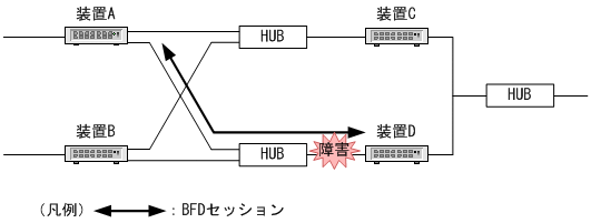 装置Aと装置Dの間にHUBがあるため,装置Aではリンク障害を検出できないでリンクアップしたままになります。しかし,BFDパケットを受信しなくなることによって,障害検出時間の経過後にBFDセッションでは障害を検出できます。このように,システム間にL2スイッチなどが存在して対向装置の障害が伝わらないときなどにBFDは有効です。